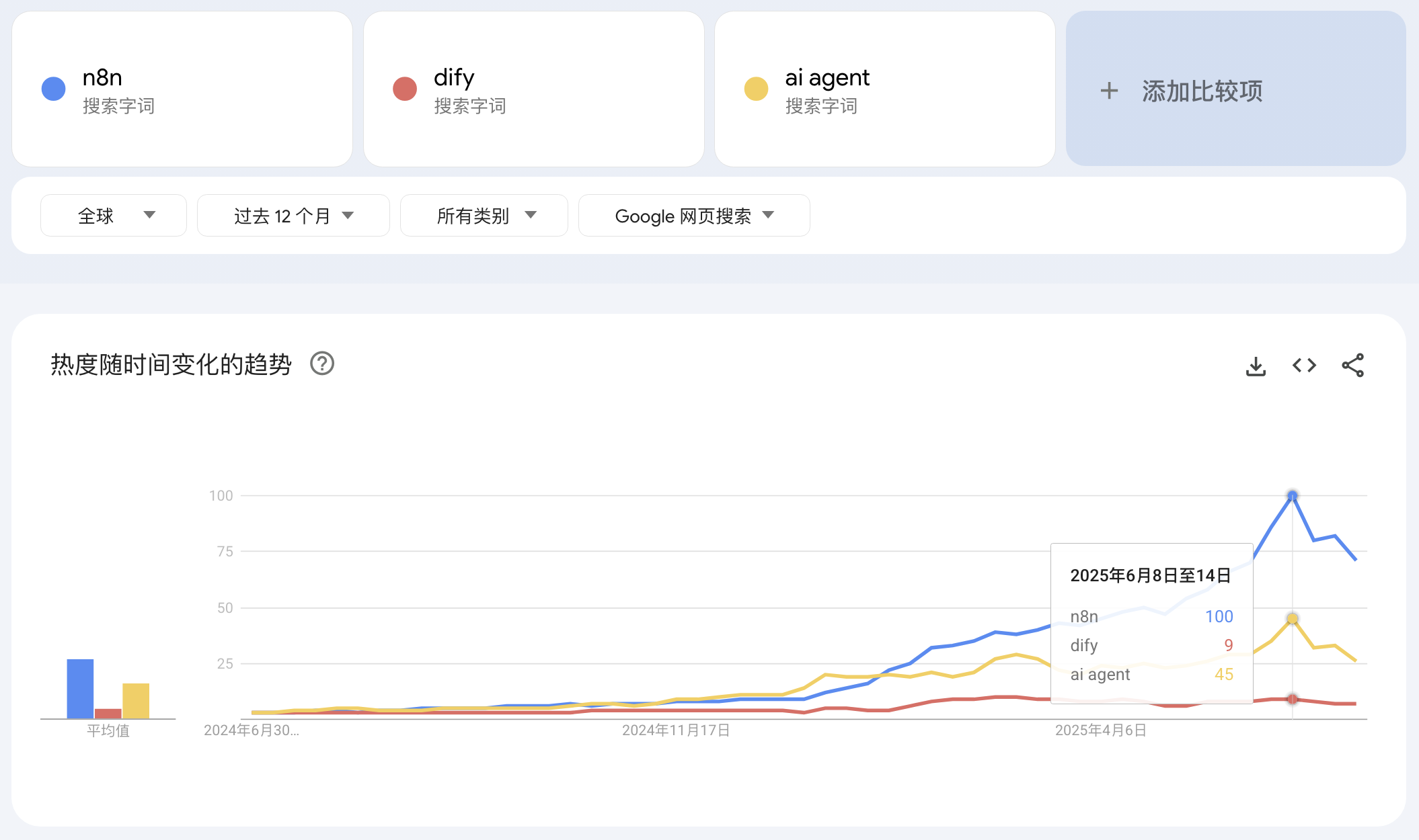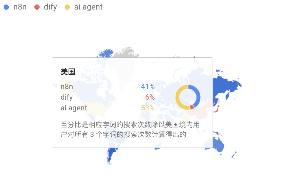 我的数据洞察: 通过分析全球趋势,我发现 n8n 在全球的搜索热度正以惊人的速度暴涨,尤其在美国(热度占比 41%),它已成为许多创新企业的标配。然而,在中国,n8n 的认知度却严重不足(热度仅占 14%)。我们很多优秀的企业,正在错过这个强大、开源且灵活的AI自动化引擎。